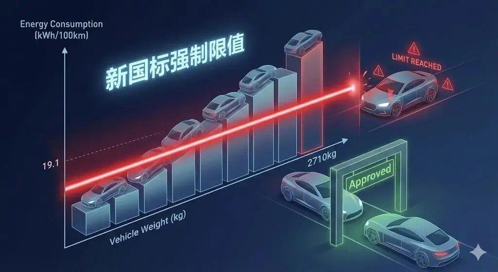 新标准的用意很直白:重量每多100公斤,允许电耗可以多一点,但整体红线压着你必须做高效车,不许光靠电池硬扛。