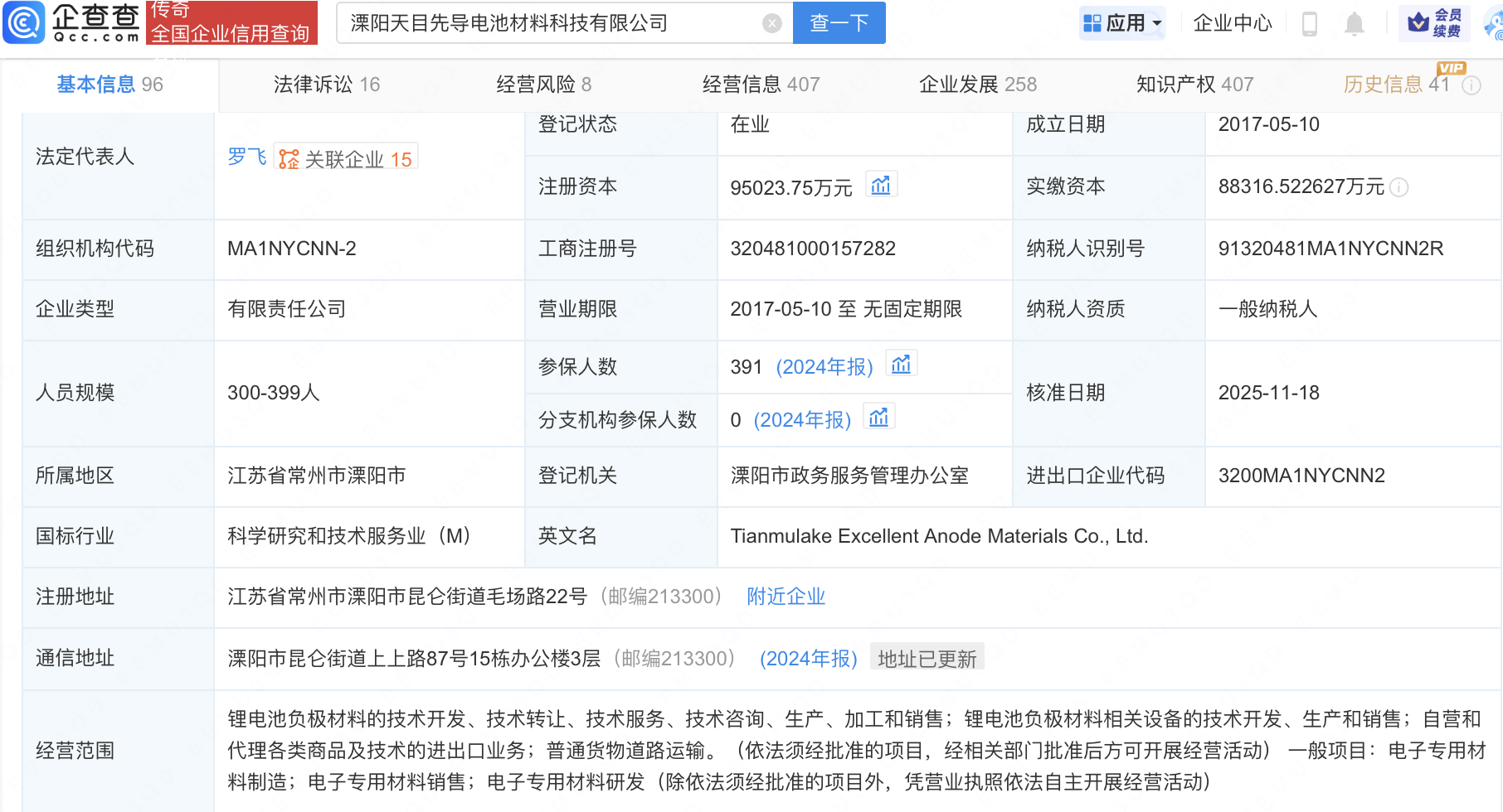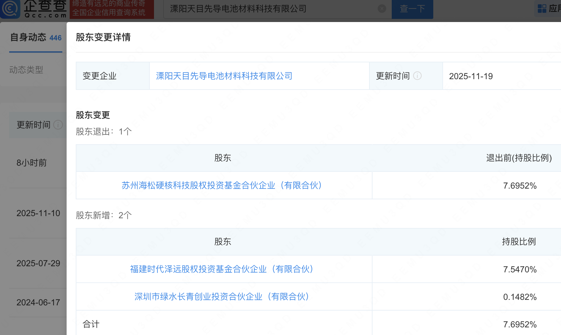 近日专业配资平台排名第一,溧阳天目先导电池材料科技有限公司发生工商变更,原股东苏州海松硬核科技股权投资基金合伙企业(有限合伙)退出,新增宁德时代(300750)参投的福建时代泽远股权投资基金合伙企业(有限合伙)等为股东。企查查信息显示,该公司成立于2017年,注册资本约9.5亿元人民币,经营范围包括锂电池负极材料相关设备的技术开发、生产和销售等。公开信息显示,天目先导专注于锂离子电池高端纳米硅基负极、固态电解质及钠离子电池硬碳负极材料的研发生产。